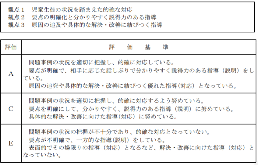日常の教育活動における具体的な問題事例への対処の仕方について、実践的な対応能力や指導力を備えているかどうかを評価するものです。